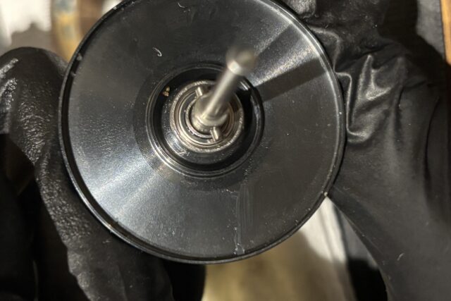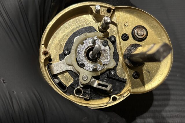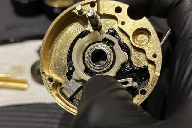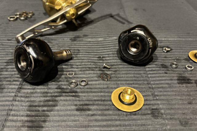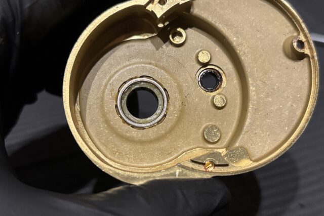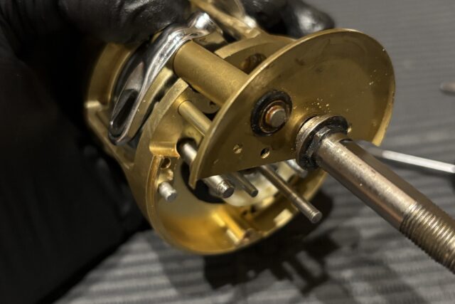 ハンドルノブは浸水しやすくほぼベアリングの動作不良が確認されます。ベアリングを交換し回転性能を取り戻していきます。