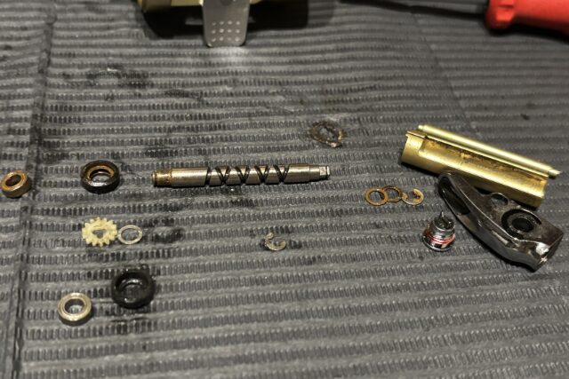 分解完了です。パーツの破損はなくパーツ交換は必要ないと思います。ベアリングは錆びているものが多く交換していきます。