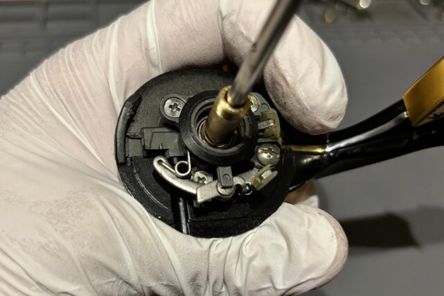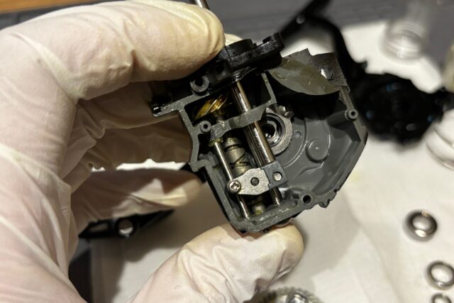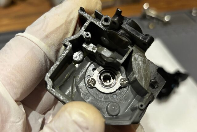 ボディ内部の確認をしていきます。内部は古いグリス汚れを多く認めます。