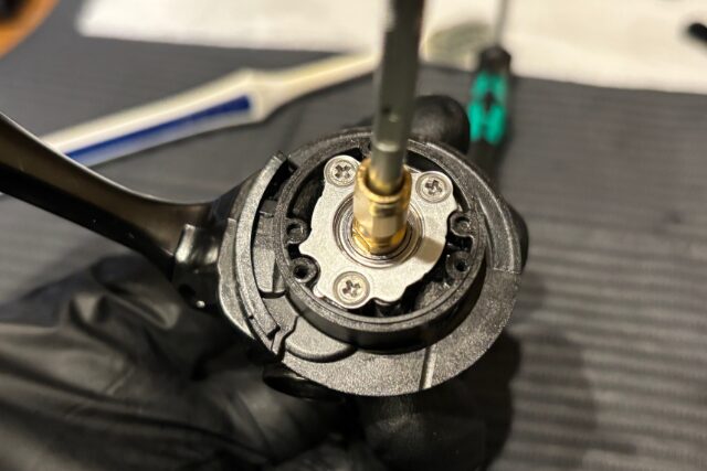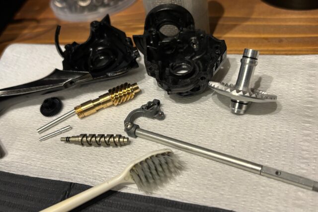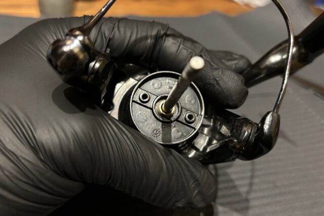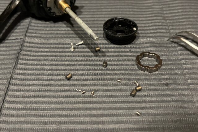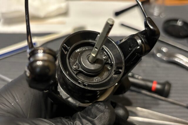 整備前の状態確認では外観での破損はなし。巻き取り時にシュルシュル音を感じます。リールの逆回転の理由としてワンウェイクラッチの異常がほとんどです。より細かくチェックしていきます。