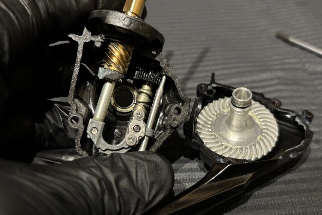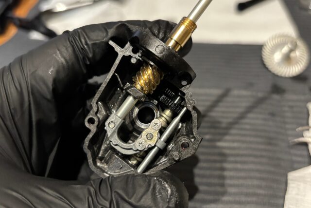 洗浄後はピニオンギア、ドライブギアや必要箇所にグリスを塗布していきます。